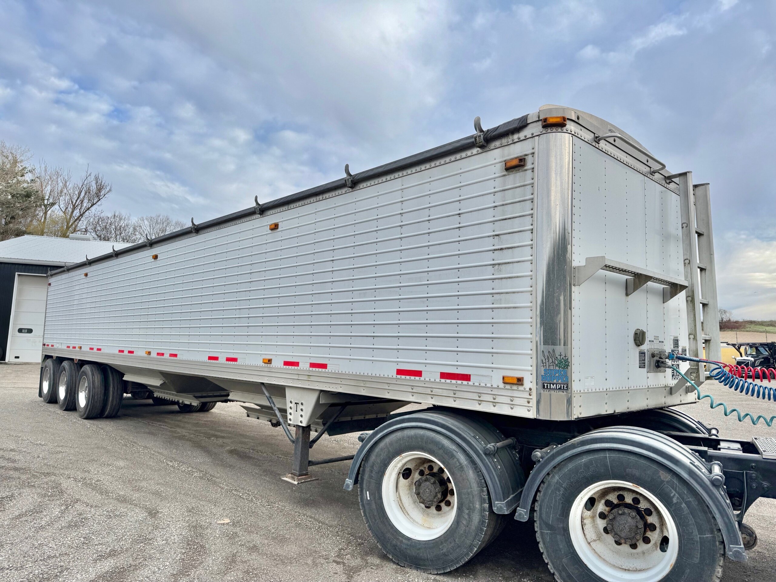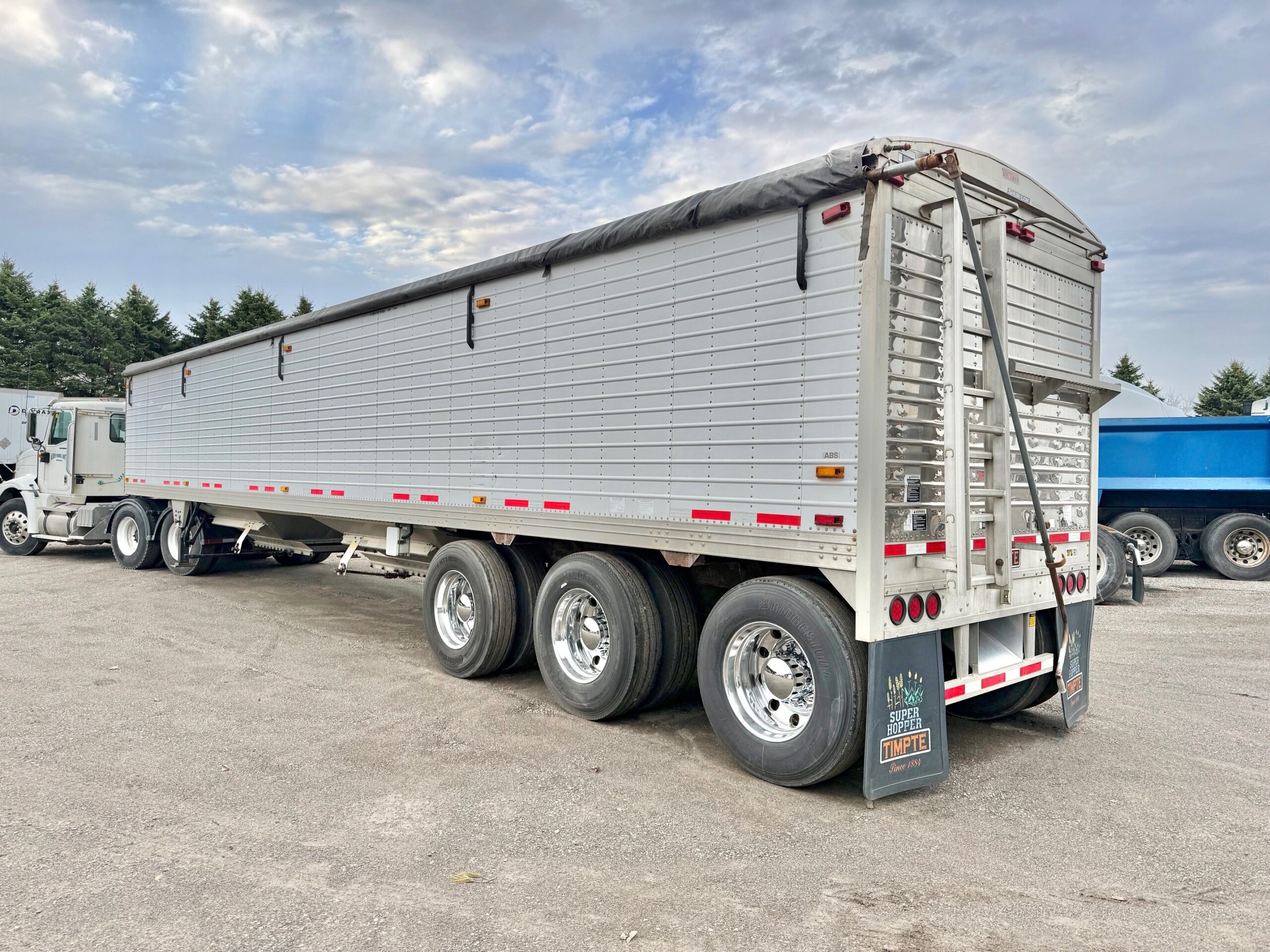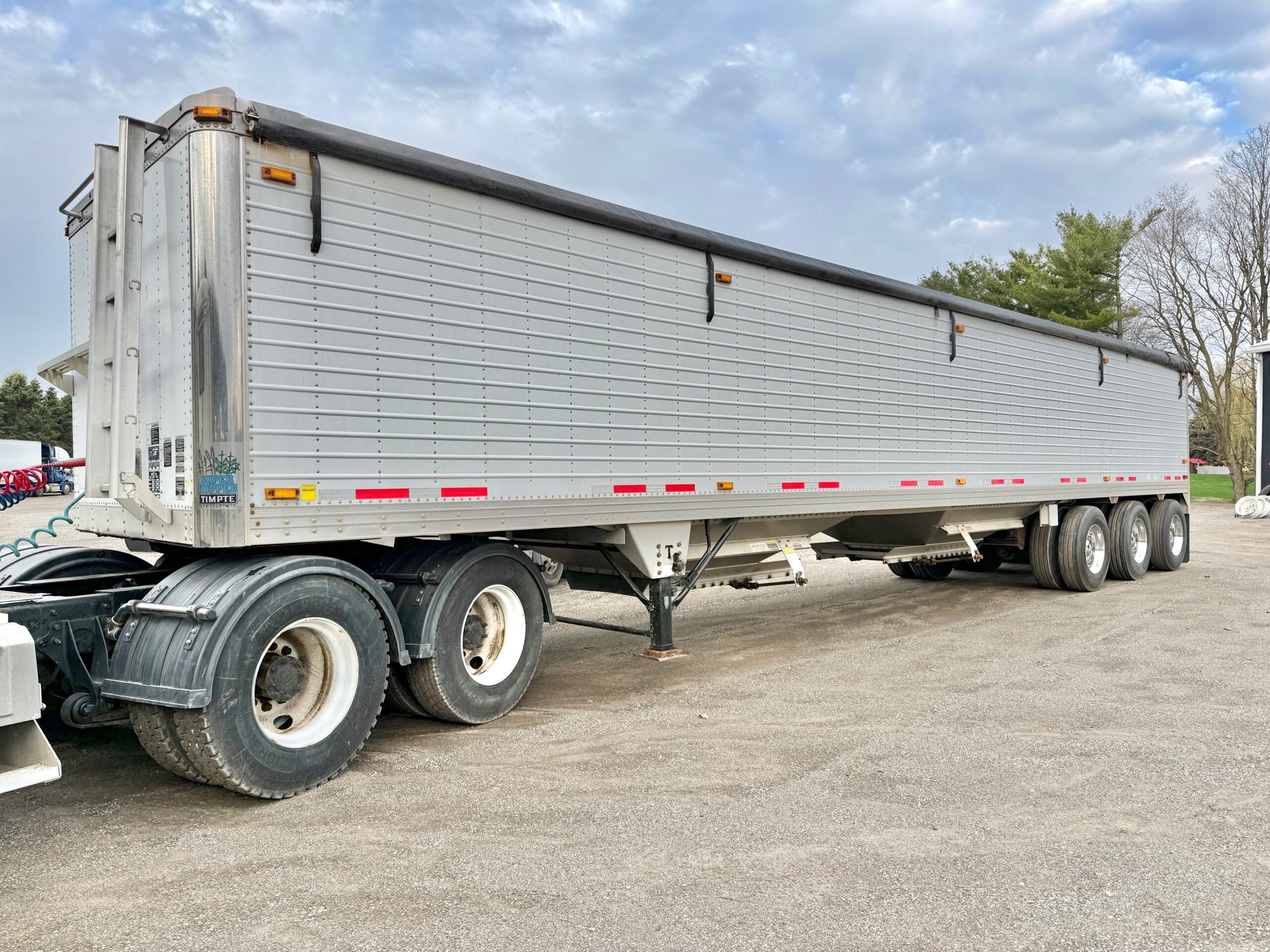 CLEAN, LIKE NEW, ALL ALUMINUM 45’ X 102” TRIDEM GRAIN HOPPER TRAILER, 3 COMPARTMENTS WITH BOTTOM UNLOADER CRANK OPEN AND CLOSE DOORS, DRUM BRAKES, GVWR ON ID TAG SAYS 35,000 KGS/ 77,000 LBS, 49” COUPLER HEIGHT, OVERALL HEIGHT 11’4”, STAINLESS STEEL FRONT CORNERS, HOLLAND 2-SPEED LANDING GEAR, STAINLESS STEEL REAR PANEL, FRONT AND REAR ACCESS LADDERS, WATER TIGHT SURELOK ROLL OVER TARP SYSTEM, REAR BEHIND BACK AXLE HOPPER CHUTE, LED LIGHTS, ABS BRAKES, LEFT SIDE SUSPENSION DUMP VALVE BOX, SIDE HEIGHT 10’4”, OVERALL LENGTH 45’.