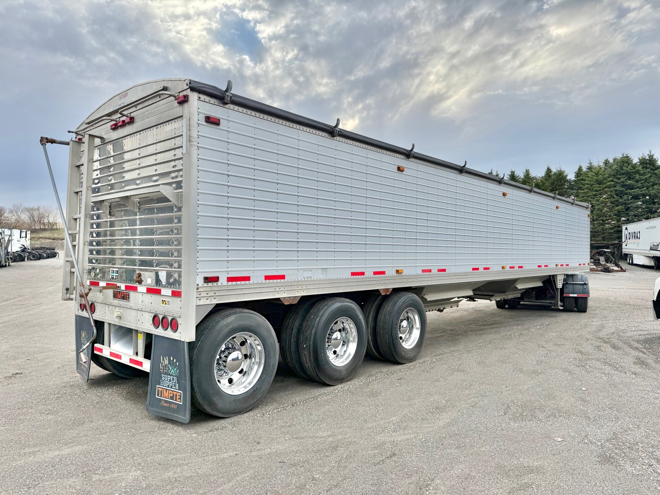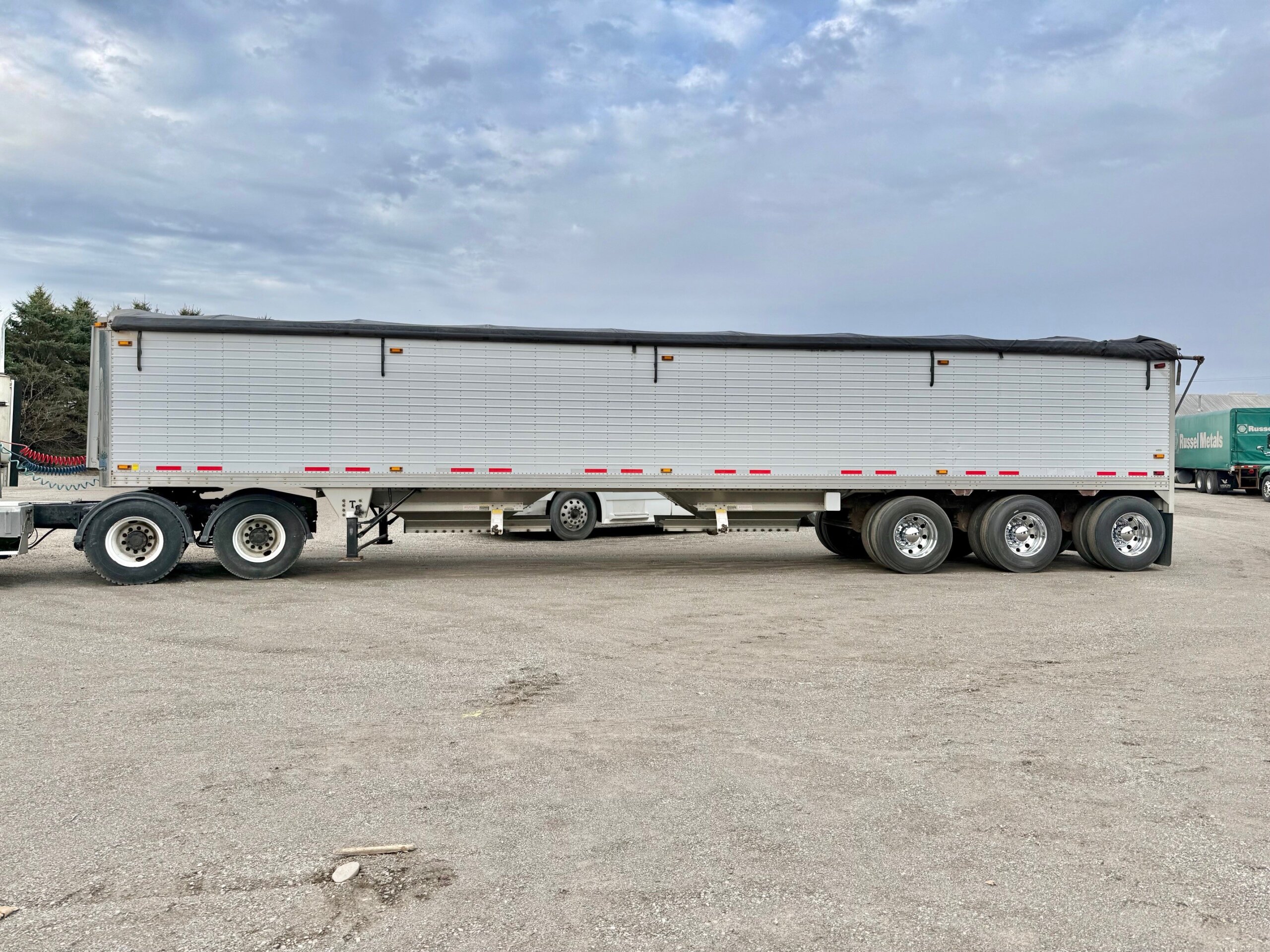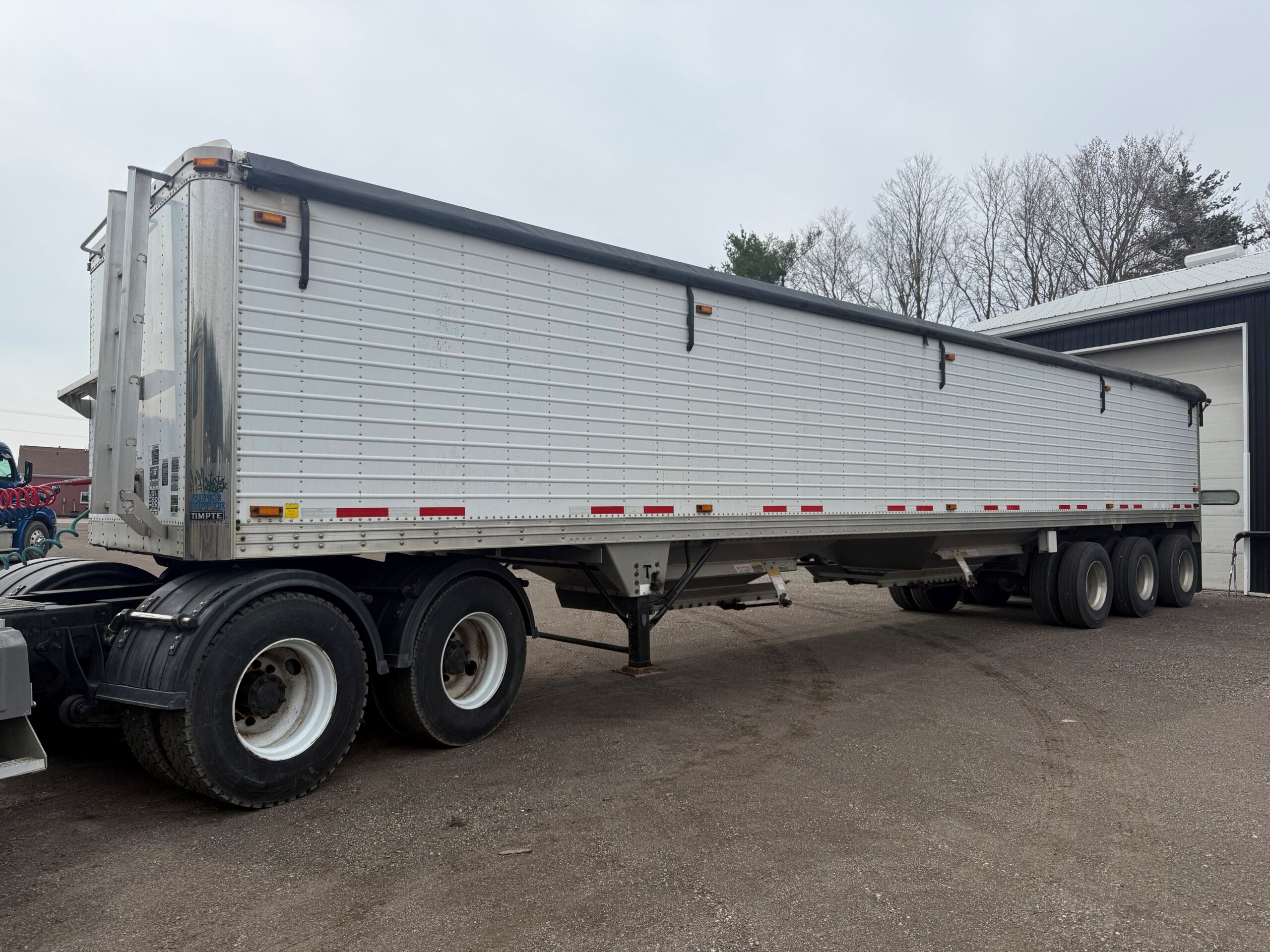 CLEAN, LIKE NEW, ALL ALUMINUM 45’ X 102” TRIDEM GRAIN HOPPER TRAILER, 3 COMPARTMENTS WITH BOTTOM UNLOADER CRANK OPEN AND CLOSE DOORS, DRUM BRAKES, GVWR ON ID TAG SAYS 35,000 KGS/ 77,000 LBS, 49” COUPLER HEIGHT, OVERALL HEIGHT 11’4”, STAINLESS STEEL FRONT CORNERS, HOLLAND 2-SPEED LANDING GEAR, STAINLESS STEEL REAR PANEL, FRONT AND REAR ACCESS LADDERS, WATER TIGHT SURELOK ROLL OVER TARP SYSTEM, REAR BEHIND BACK AXLE HOPPER CHUTE, LED LIGHTS, ABS BRAKES, LEFT SIDE SUSPENSION DUMP VALVE BOX, SIDE HEIGHT 10’4”, OVERALL LENGTH 45’.